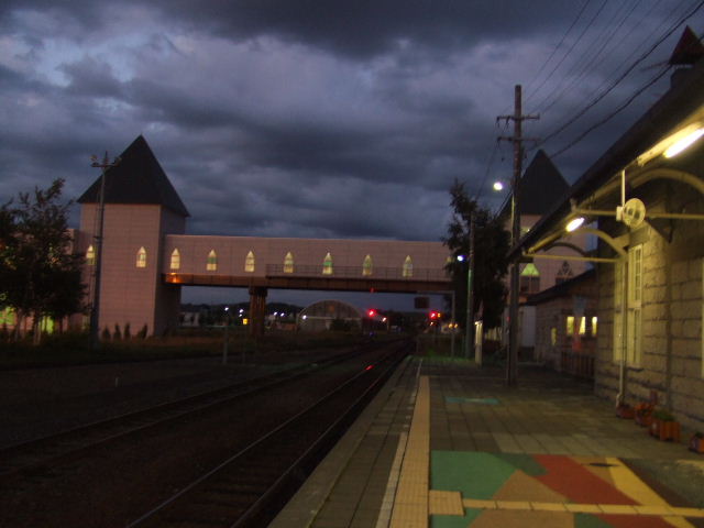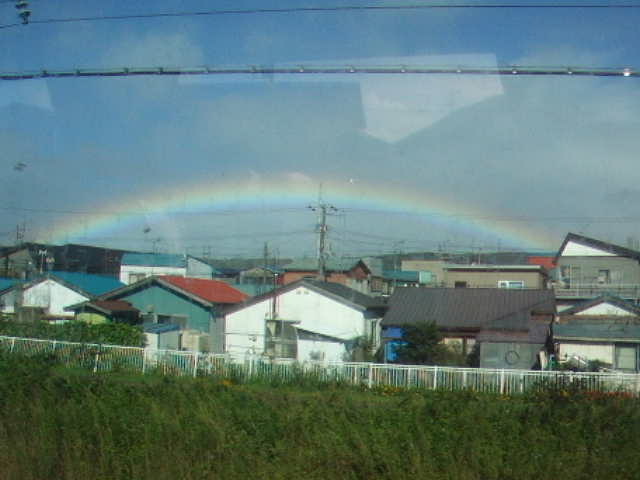 從北海道回東京的路線原本計劃搭乘「北斗星號」寢台列車(臥舖火車),突如其來的颱風取消當天所有夜間的火車班次,也打亂我們的行程,只好在札幌多待一晚第二天早上再出發。清晨離開札幌時仍有小小風雨,天色陰陰灰灰的,火車越往南行陽光也漸漸多了幾分,前一晚的YH有點簡陋其實睡得並不好,但到火車上吃完早餐後絲毫沒有睡意,只想好好把握這最後多看幾眼北海道景色的幾個鐘頭。在駛離札幌約一個小時後,窗外忽然多出一道好完整的彩虹,本以為彩虹稍縱即逝,它卻一路伴隨著我們前進大約20幾分鐘,窗外的景色不斷變化,在那幾十分鐘內它一直沒離開過,最後火車漸漸轉向朝右方行駛,也就是向著彩虹的方向,我們就這樣從虹橋下方通過,我想像在最前方的火車駕駛員一定感到很幸福吧,還是只有我發現這個秘密呢?!(因為大部分的人都在睡覺 :P ),這是老天爺為我們餞行的禮物。