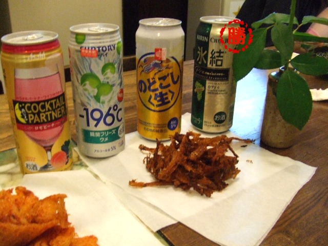 在日本即使是逛便利商店也是件令人興奮的事,抵達的第一個晚上我們就迫不及待的準備在YH的日式禪風Lounge中小酌一番,日本人不愧是愛喝酒的民族,便利商店中有一整個開放式冰櫃陳列各式啤酒,旁邊還有另一個冰櫃滿是水果氣泡酒及罐裝雞尾酒,個個包裝可愛到不行,正中我下懷。東挑西選下,最後買了KIRIN的冰結 Chardonnay Sparkling (夏多內氣泡酒, Chardonnay是一種釀製白葡萄酒的普遍品種), SUNTORY的梅子氣泡酒和ASAHI的COCKTAIL PARTNER(葡萄&水蜜桃口味)。在我們四位